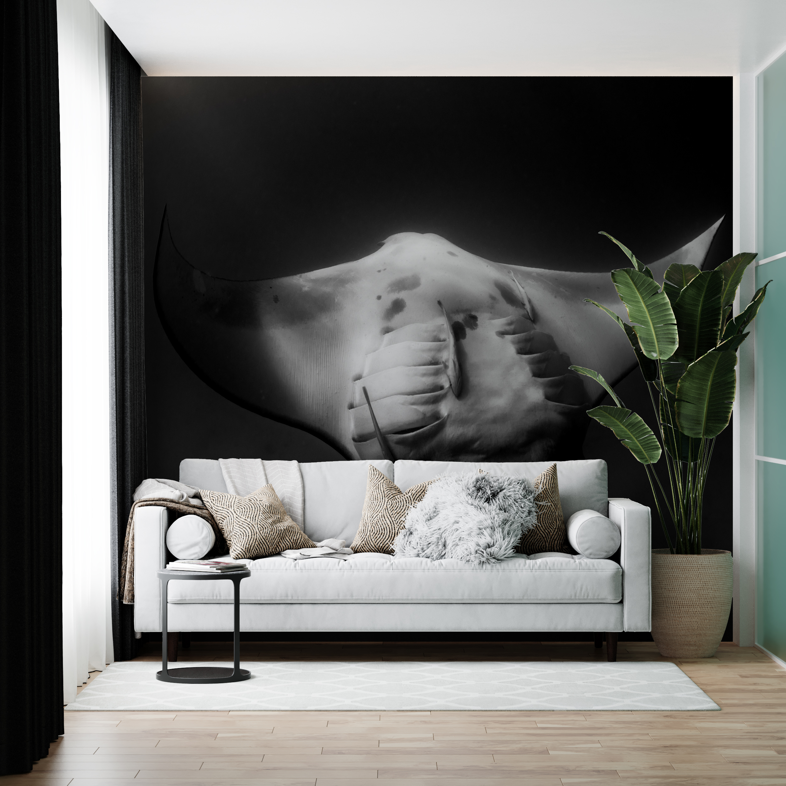 Wij zorgen dan voor een extra afloop rondom zodat u genoeg marge heeft indien de muur niet helemaal haaks is. Dit doen we overigens ook bij levering van behang in banen.